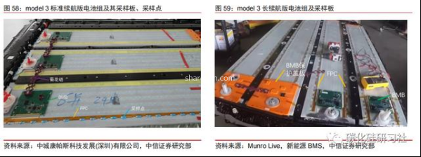 在 BMS 的控制下,具体对电池组进行监测的是 BMB 电路板,对于特斯拉 model 3而言,共有 4 个电池组,每一组配备一个 BMB 电路板,并且 4 个电路板的电路布局各不相同,彼此之间可以很容易地利用电路板上的编号进行区别,并且按照顺序用菊花链连接在一起,在 1 号板和 4 号板引出菊花链连接到主控板的 P5 和 P6 接口。我们本次拆解的model 3 单电机标准续航版电池组较短,沿着每个电池组都布置了一条 FPC(柔性电路板),并且在其沿线设置了对电池进行采样的采样点,每个采样点都用蓝色聚氨酯进行覆盖保护,较后在 FPC 上方覆盖淡黄色胶带进行保护。需要注意的是,标准续航版尽管每个电池组仍有两条淡黄色胶带,但只有其中一条下面有 FPC,另一条仅起到对下方电池触点的保护作用。而对于长续航版本,由于电池较多,每个电池组都需要分成两条 FPC 进行采样。